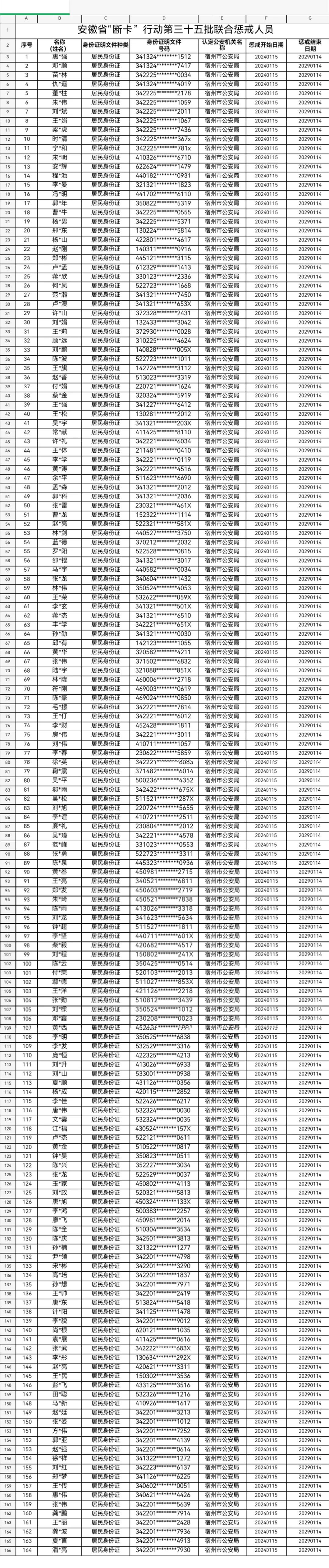 为严厉打击整治非法开办贩卖手机卡、银行卡违法犯罪,坚决遏制电信网络诈骗犯罪的高发态势,切实维护社会治安大局稳定,安徽省打击治理电信网络新型违法犯罪工作联席会议办公室公布“断卡”行动第三十五批联合惩戒名单。
